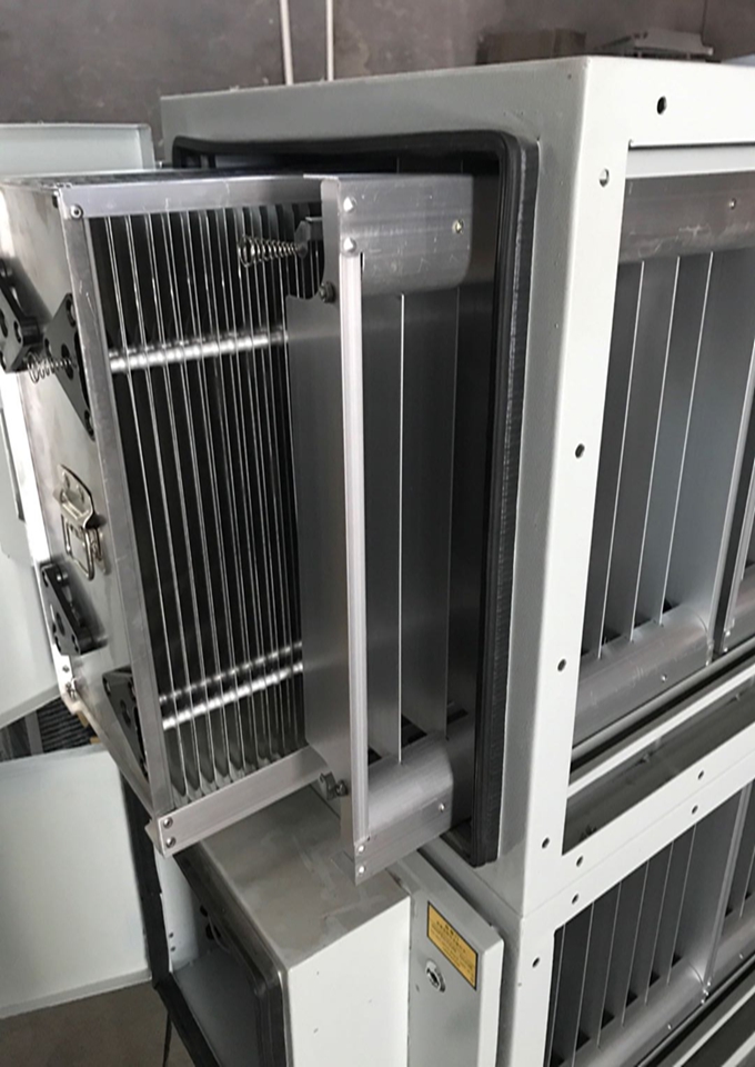 熱處理油煙廢氣在風(fēng)機(jī)的作用下,氣體通過特殊制作的機(jī)械除油過濾模塊,可將煙氣中的5um以上油滴冷凝攔截下來;剩下的煙霧氣體(小油霧滴、油氣、煙氣、有機(jī)物)在通過無盲區(qū)電場時被電離、分解、碳化被吸附,**后達(dá)標(biāo)排放。