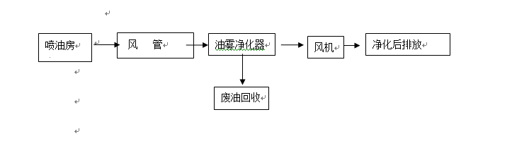 具體流程:每個(gè)噴油房上部設(shè)有廢氣收集裝置,通過管道把廢氣收集裝置收集廢氣集中在風(fēng)機(jī)的引力下輸入到柯藍(lán)斯達(dá)油霧凈化設(shè)備。油霧廢氣經(jīng)過我們的油霧凈化器處理后可以達(dá)到環(huán)保要求,并且油霧凈化器可以把油霧廢氣中的防銹油大部分收集下來供二次使用,可以為公司節(jié)省大量的生產(chǎn)成本。其大概流程如下: