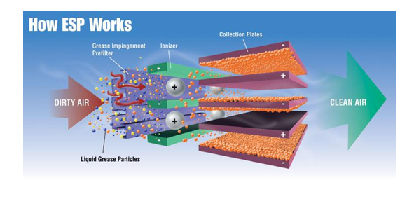 濾器,油霧在通過金屬絲網(wǎng)過濾器時經(jīng)過過濾、碰撞吸附大顆粒油霧,分離出的大顆粒油液落入集液槽內(nèi),含細(xì)小油霧的污染空氣從預(yù)過離器流出后經(jīng)過第二級板網(wǎng)式過濾器既鋁合金絲網(wǎng)多重過濾器,油霧經(jīng)整流、碰撞、吸附、凝聚等過程后,油霧和較小粉塵被阻流在絲網(wǎng)上,凝結(jié)成液滴在重力的作用下落入積液槽,含細(xì)小粉塵和油霧的污染空氣第二級預(yù)分離器流出后進入靜電過濾段。在荷電區(qū)(電離區(qū)),12KV 的直流高壓場的作用下,使氣體電離,產(chǎn)生大量自由電子及正離子,當(dāng)含油氣體通過存在大量離子及電子的空間時,離子及電子會附著在粉塵上,附著負(fù)離子和電子的粉塵荷負(fù)電,附著正離子和電子的粉塵荷正電,附著電荷的粉塵從荷電區(qū)出來后進入收塵區(qū),在 6KV 電場力的作用下,荷電粉塵向其極性相反方向運動,粉塵吸附在電極上,細(xì)小的粉塵和油霧被分離,潔凈空氣在風(fēng)機負(fù)壓的作用下,經(jīng)風(fēng)機直接排入空氣中。