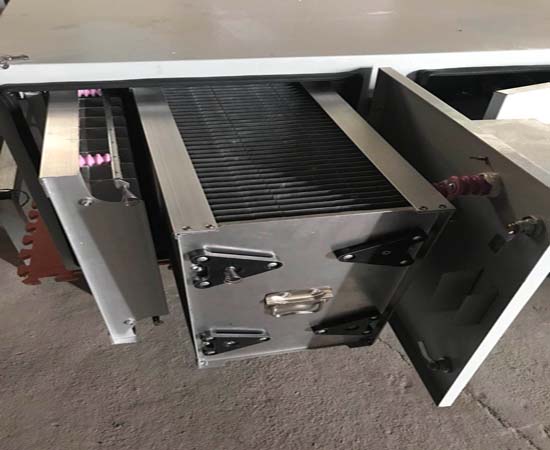 柯藍斯達高效油煙凈化裝置,采用的是雙區(qū)板式凈化方式。雙區(qū)板主要包含高壓電離區(qū)和低壓吸附區(qū)。油煙污染氣體從進風(fēng)口進入主機內(nèi)部,首先在高壓電離區(qū)被電離,使得污染氣體中的顆粒帶有電荷,隨后帶有電荷的氣體經(jīng)過收集板,由于低壓吸附區(qū)帶有與電離板相反的電荷,可以使得帶有電荷的污染氣體被收集板收集,達到凈化的效果。